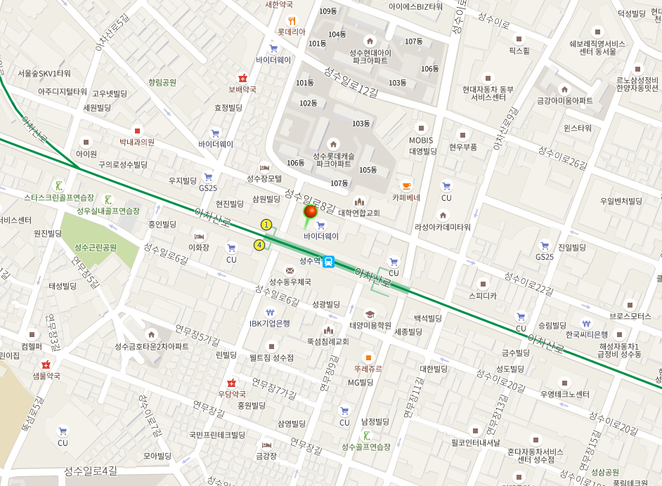 지하철: 지하철 2호선 성수역 1번 출구